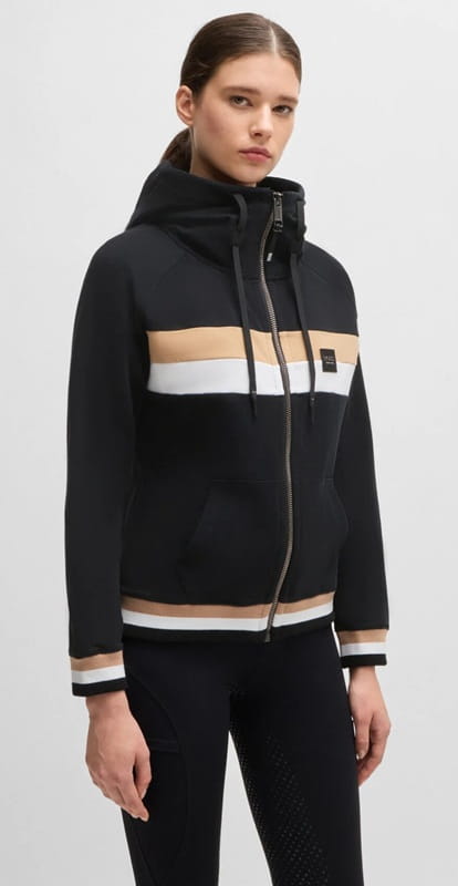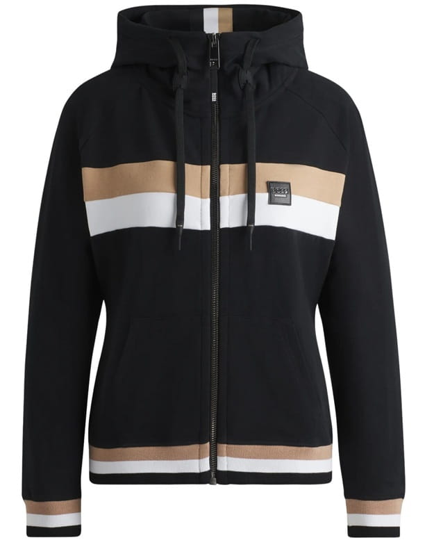 Bestsellerowa kurtka z kapturem zapinana na zamek błyskawiczny i naszytymi kieszeniami typu kangur. Posiada dwa kontrastowe paski na piersi oraz naszywkę z logo BOSS Equesttrain ze sztucznej skóry. Charakterystyczne paski zdobią ściągacze przy mankietach i korpusie. Wykonana z supermiękkiej włoskiej dzianiny dresowej z dodatkiem stretchu, szczotkowanej od wewnątrz, co zapewnia miękkość i wygodę.