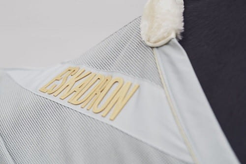 Derka Eskadron 3D-FLEECE MELANGE wysokiej jakości antypillingowy polar trójwymiarowy solidna trójwymiarowa struktura plastra miodu w melanżowym wyglądzie złota lamówka na szerokiej błyszczącej oprawie ukośna łatka w kłębie i trójwymiarowe napisy po obu stronach kłąb ze sztucznego futra podwójne zapięcie na piersi z mocowaniem na rzep zdejmowane poprzeczki i zintegrowana taśma ogonowa.