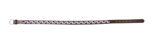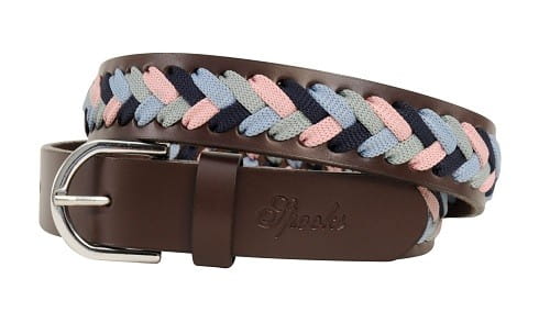 Stylowy skórzany pasek z kolorową plecioną ozdobą i zapięciem na sprzączkę.